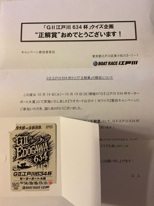 10月に開催された「GⅡ 江戸川634杯」でのクイズに正解しました。