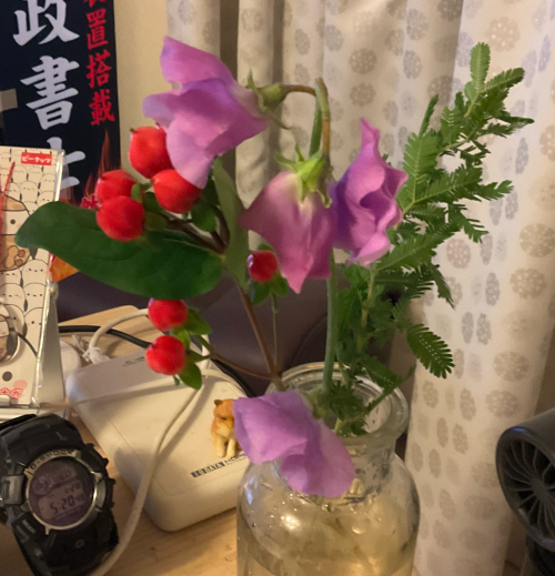 今週のお花(ヒペリカム、アカシア、スイトピー)