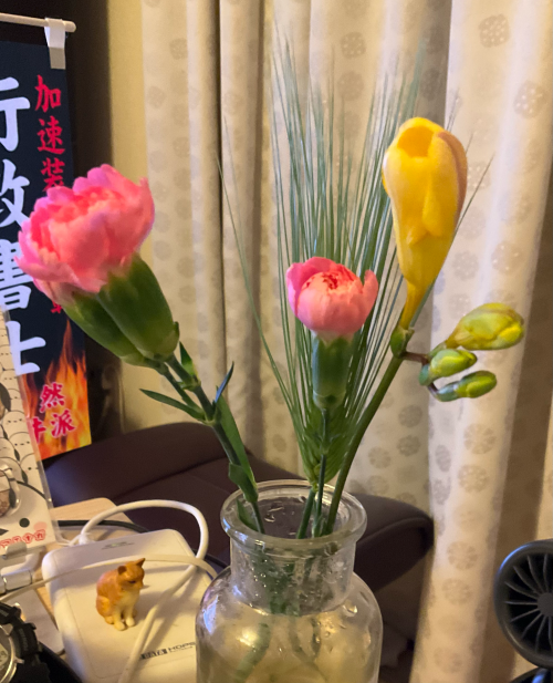今週のお花(ムギ、フリージア、スプレーカーネーション)